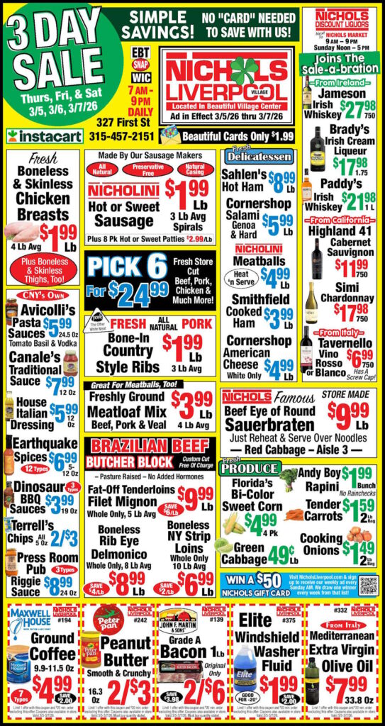 Welcome to Nichols Supermarket in Liverpool. Please browse around to see what our full service supermarket has to offer. Check back often as we regularly update this site with the current ad each week, as well as showcase new items as soon as they arrive on our shelves.
